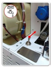 - Adjust the water flow if needed. The adjustment is made by turning the regulator with a screwdriver on the back panel of the machine: