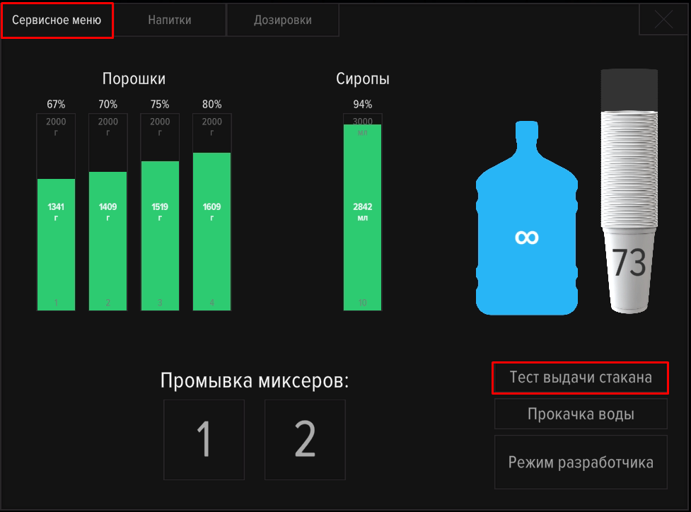 Check the operation of the dispensing unit (without loaded cups) using the "Cup test" button.
