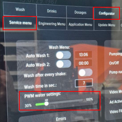 If the water level is below the green line, increase the water flow. To do this, open the service menu and go to Configurator - Service Menu. Find the “Water PWM Setting” option.